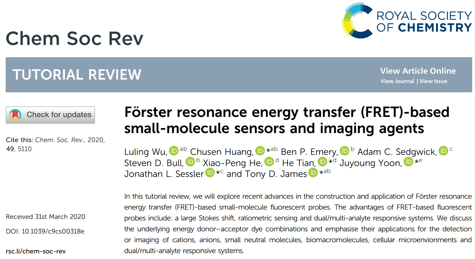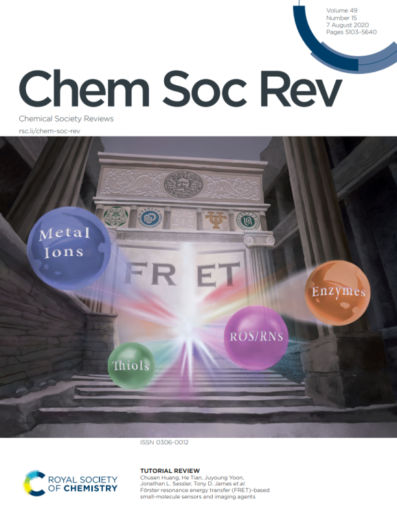 近期,海角网黄楚森副教授作为通讯作者的文章“Förster resonance energy transfer (FRET)-based small-molecule sensors and imaging agents”刊发于英国皇家化学会综述刊物Chemical Society Reviews《化学学会评论》(影响因子42.846),并被选为当期的正封面文章。
