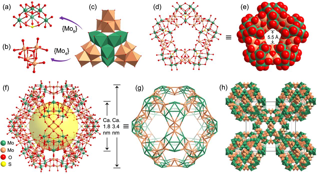 多金属氧酸盐(POM)由于其多种多样的结构和丰富的物理化学性质,是构建高核、高对称性的空心开口多面体笼的二级构建单元(SBBs)。目前,已成功探索出几个著名的以钼酸盐为SBBs的空心开口巨型多面体笼,包括最高核的空心开口二十面体Mo132和最高核空心开口立方体Mo84(图1)。然而,具有较高核数和对称性的空心开口多面体笼的发展仍处于起步阶段。