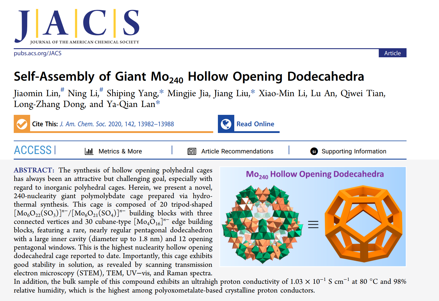 近日,资源化学教育部重点实验室林焦敏副研究员在多酸化合物合成取得了新的进展,相关成果在国际期刊JACS(Journal of the American Chemical Society)上在线发表,并被当选为当期的封面文章。论文题目为《Self-Assembly of Giant Mo240 Hollow Opening Dodecahedra》。海角网杨仕平教授、南京师范大学兰亚乾教授以及刘江副教授为论文的通信作者,海角网林焦敏副研究员和华南师范大学李宁博士为论文的共同第一作者。
