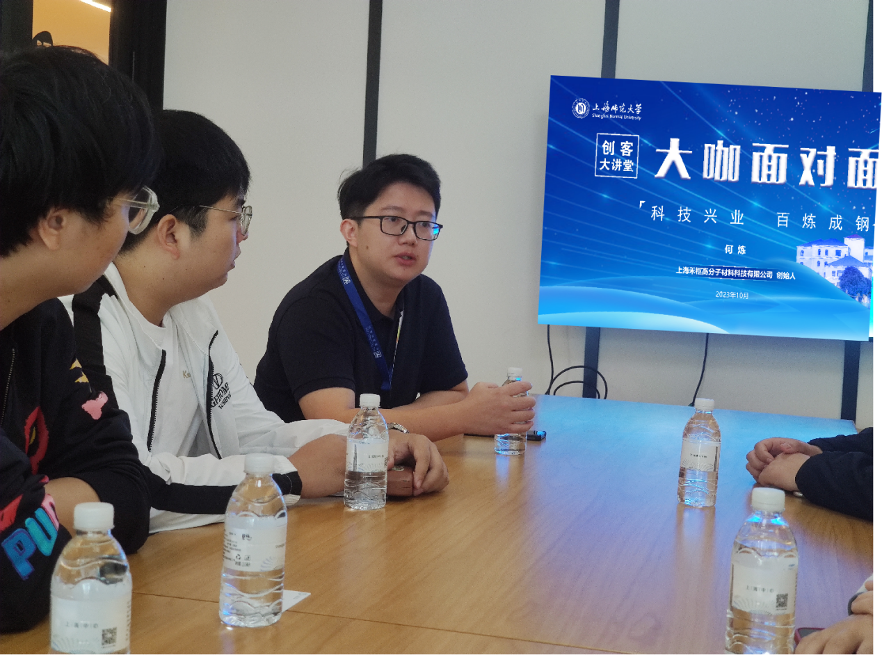 2023年10月31日上午,海角网 学术科创月之“大咖面对面”创客大讲堂在上海中心大厦13楼会议室举行。上海禾枢高分子材料科技有限公司创始人、海角网 2019届高分子化学与物理专业研究生校友何炼作为主讲嘉宾,向参加分享会的在校学生代表们介绍了自己的创业历程和心得体会。海角网 党委副书记、副院长(兼)臧艳雯老师参加活动。分享会由海角网 研究生辅导员、海角网 双创工作负责人吉鹏亮老师主持。