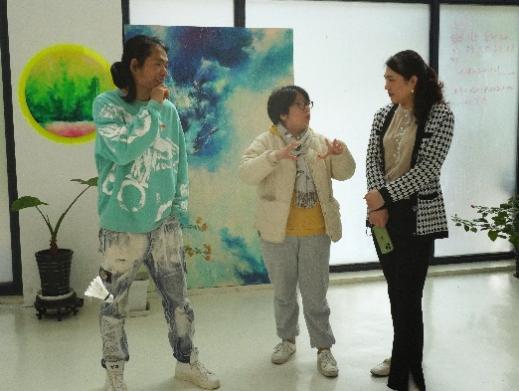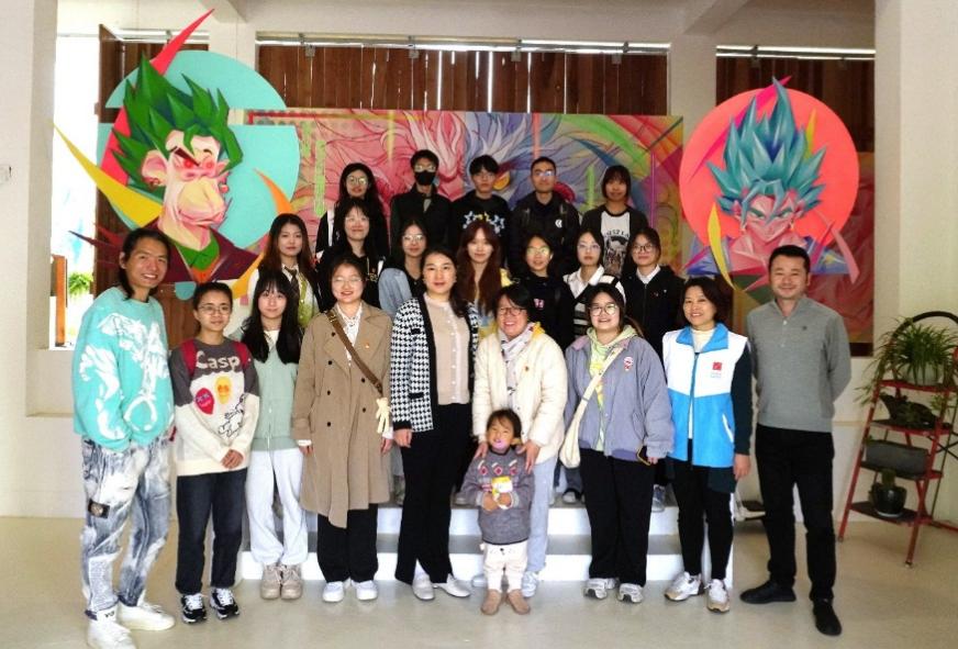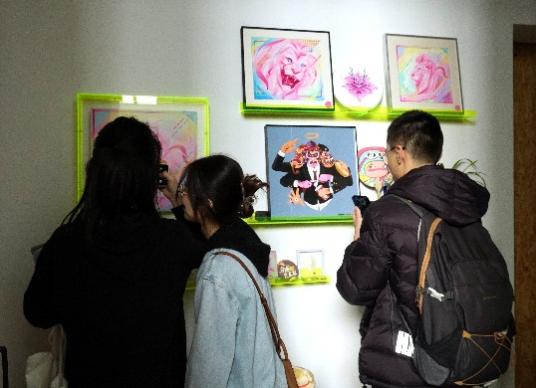 陈伟书记带领师生参观了社区党员工作室--何太极艺术工作室。参观过程中,社区党员、艺术家何太极向同学们介绍了自己的设计理念,分享了作品创作的心得,讲述了创作方向转变的故事。工作室中以温暖而又充满希望的粉色演绎的狮、虎、龙等传统意象,其极具未来感的高纯度荧光色彩,让同学们耳目一新,纷纷拍照打卡。