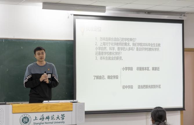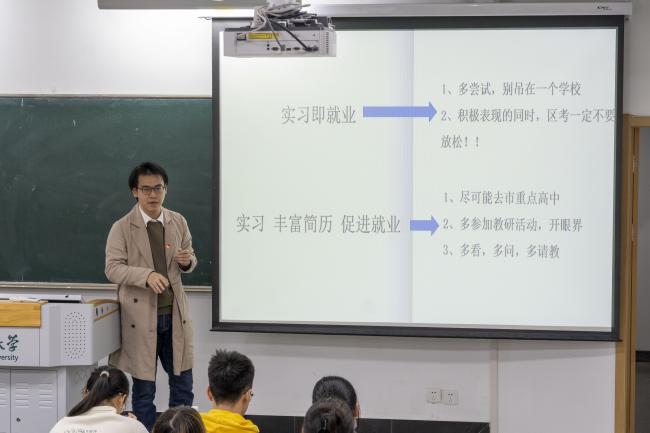 准备在中学任教的钟思韬同学从实习和就业方面给大家分享了自己的经验。首先,他指出,同学们需要了解自己,确立自己的定位,选择合适的努力目标。之后,他通过自己的实习与面试的经验,给大家介绍了教师招聘流程:简历筛选、学校笔试、学校面试试讲、编制考、体检,并强调了在面试说课和试教时需要注意的一些关键点。接着,钟思韬学长给大家提供了一些招聘平台,建议大家抓住信息渠道,了解相关招聘信息和就业指导信息。