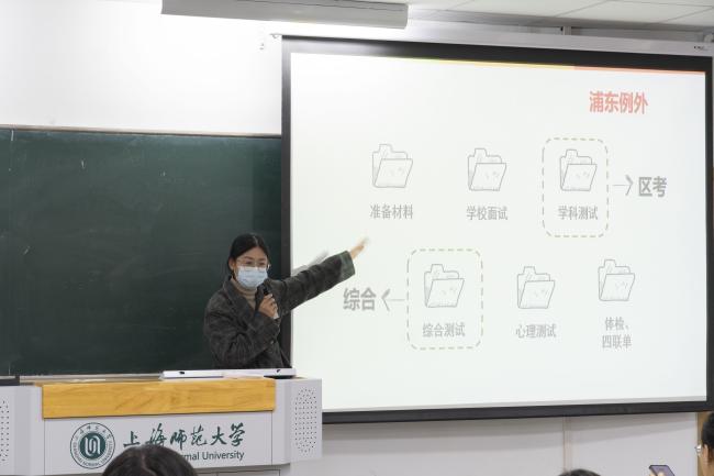 张傅怡同学根据自己在浦东新区考编的经历,给大家进行了教师考编经验分享。首先,她给大家介绍了考编的六个步骤流程:准备材料、学校面试、学科测试、体检、心理测试和综合测试,并以自己准备的简历表格为例,分析了在一份合适的简历当中需要包含的重要信息内容。之后,她给大家列出了上海不同区内的编制考试的形式以及岗位信息供同学们进行参考,也贴心地送上了面试小贴士。
