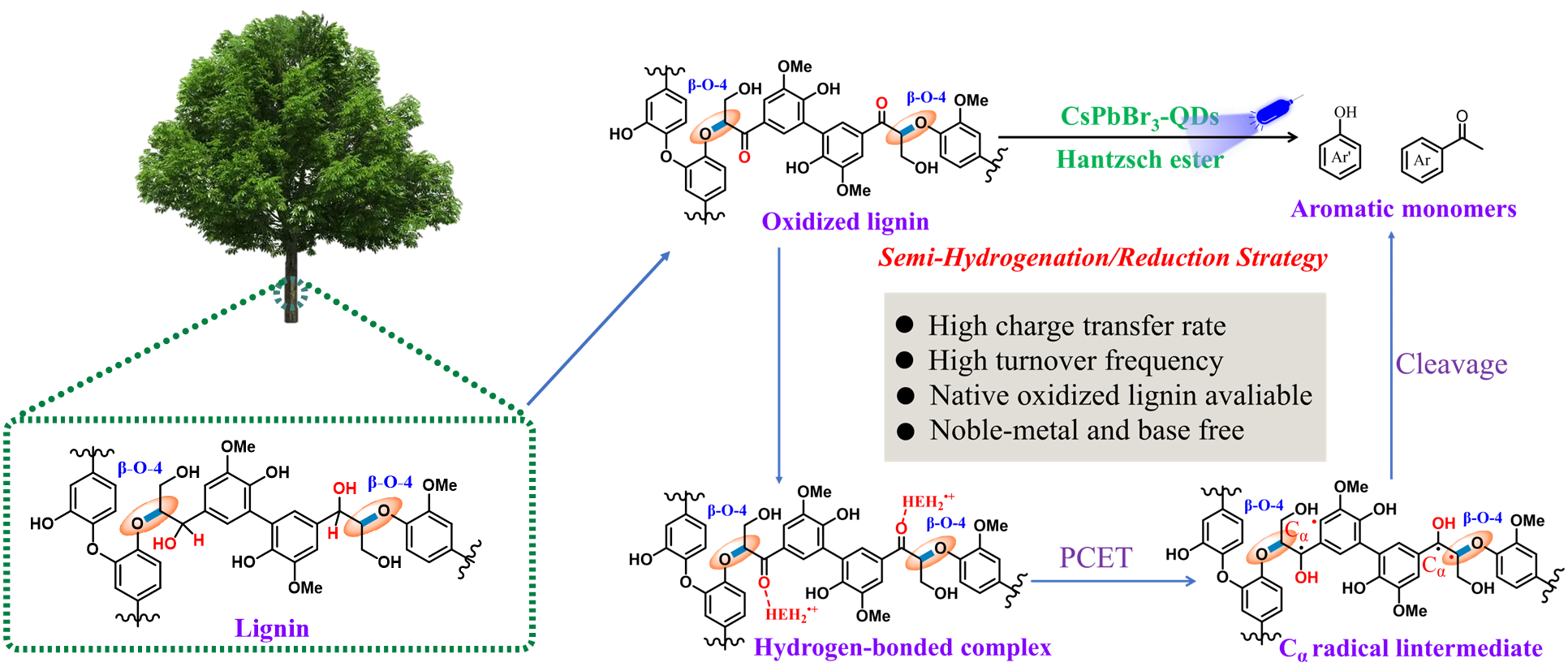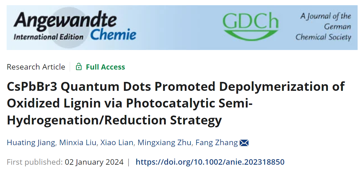 2024年1月,海角网 张昉团队在Angewandte Chemie International Edition在线发表题为“CsPbBr3 Quantum Dots Promoted Depolymerization of Oxidized Lignin via Photocatalytic Semi-Hydrogenation/Reduction Strategy”的研究文章。该研究首次利用钙钛矿量子点催化解聚木质素,为解决木质素由于自身特征(成分复杂、结构稳定和分子尺寸较大等)难以有效利用提供了一种新策略。