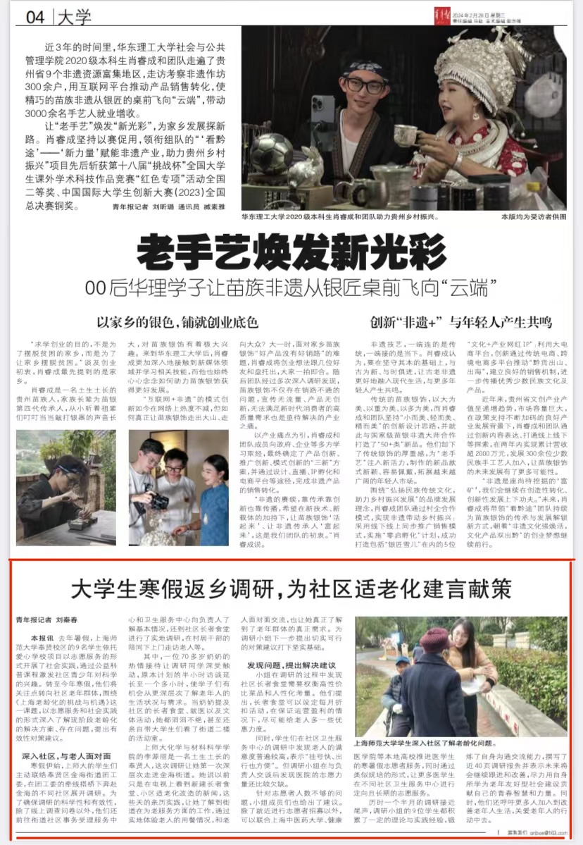《青年报》《奉贤报》等多家媒体报道了海角网由2022级本科应用化学专业李源丽同学带领开展的寒假社会调研团队项目——《基于中国社会老龄化加速下——上海老龄化的挑战与机遇调研》。
