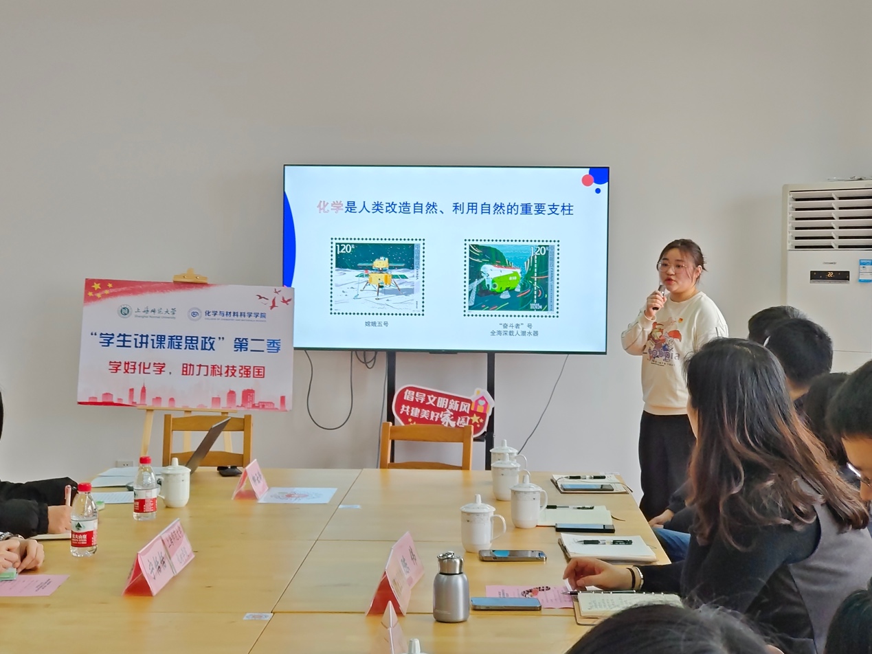 学生讲课程思政讲师团成员、2020级应用化学1班的柳云玲带来了《过氧化物——助力中国上下求索之路》主题课程,以过氧化物这种神奇的化学物质为核心,生动地展示了过氧化物在中国载人航空和载人深潜事业中发挥的重要作用。“可上九天揽月,可下五洋捉鳖,谈笑凯歌还。”这曾是毛主席在1965年对我们国家航空事业和载人深潜事业的一个伟大创想。而在今天,随着“神舟”飞船奔赴“天宫”,“蛟龙号”九潜西洋,毛主席的伟大创想如今已经化为现实,我们再一次见证了中国科技巨大的飞跃。