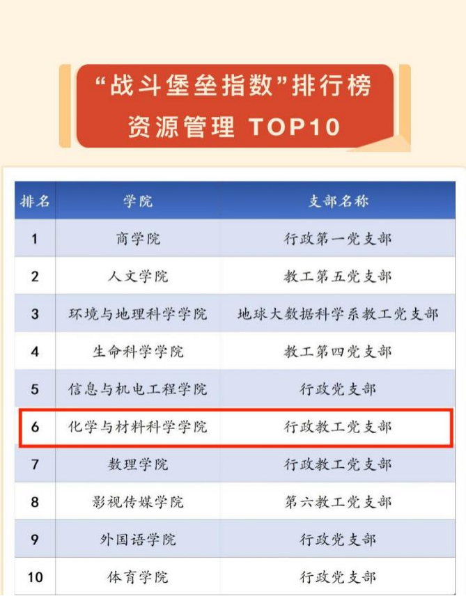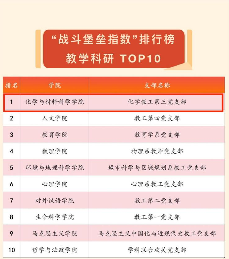 为深入学习贯彻习近平新时代中国特色社会主义思想和党的二十大精神,进一步增强教工党支部政治功能和组织功能,推动党建工作和业务工作深度融合,以高质量党建推动学校事业高质量发展,校党委组织部在汇总分析2023年度有关数据的基础上,分类推出第六期教工党支部“战斗堡垒指数”排行榜。海角网化学教工第三党支部荣登“战斗堡垒指数”教学科研TOP10排行榜;行政教工党支部荣登“战斗堡垒指数”资源管理TOP10排行榜;