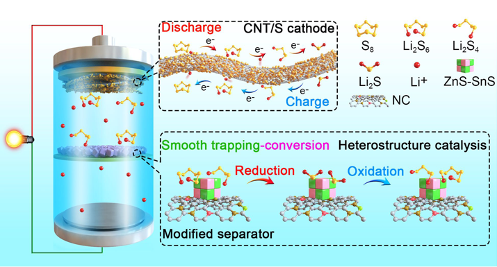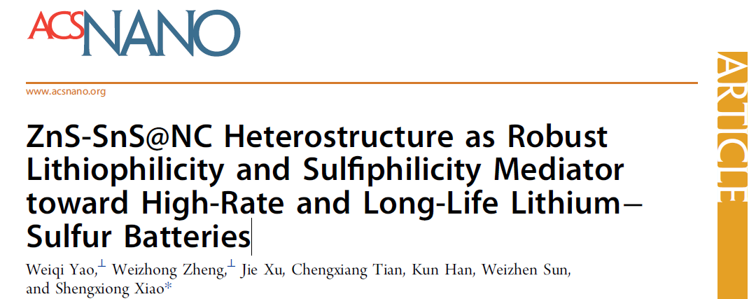 资源化学教育部重点实验室肖胜雄教授团队在锂硫电池研究领域取得新进展,相关成果近日在国际知名期刊《ACS Nano》上在线发表,论文题为“ZnS-SnS@NCHeterostructure as Robust Lithiophilicity and Sulfiphilicity Mediator toward High-Rate and Long-Life Lithium–Sulfur Batteries”。论文第一作者为海角网 姚伟奇师资博士后和华东理工大学郑伟中博士后,通讯作者为海角网肖胜雄教授。