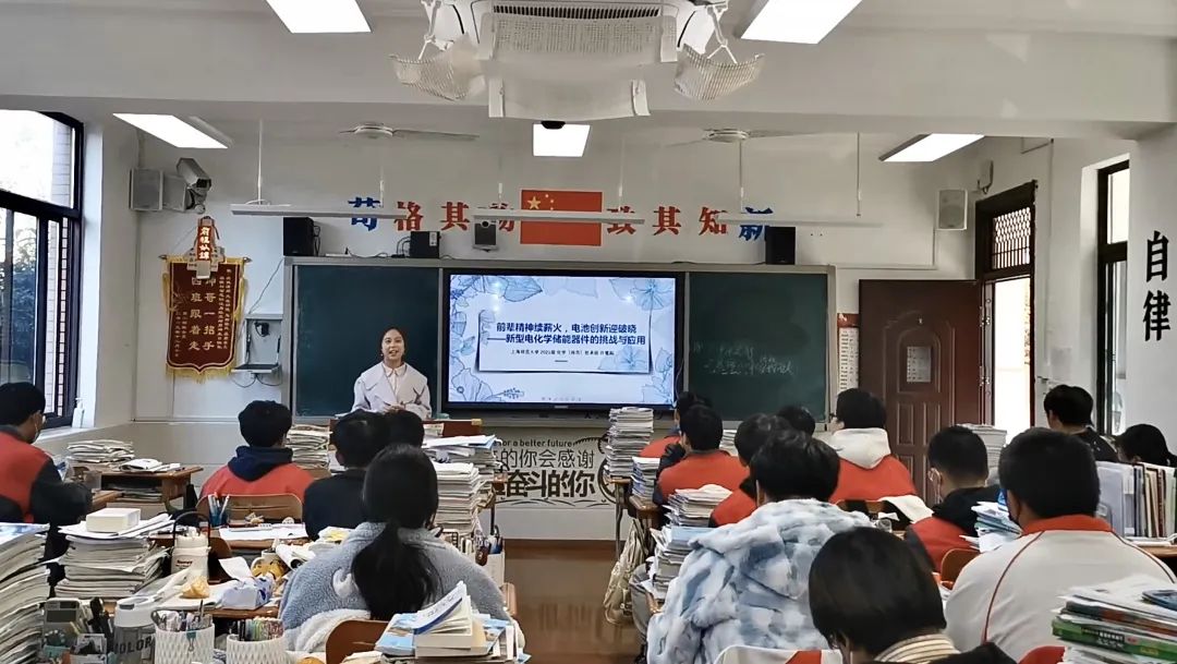 2021级化学师范(世承)班许鹭阳走进上海师范大学附属第四中学,为高三的同学们带来了《前辈精神续薪火,电池创新迎破晓——新型电化学储能器件的挑战与应用》一课。她按照化学电源的分类——铜锌原电池、蓄电池、氢燃料电池等依次展开课程讲授,并介绍了我国在锂离子电池领域上的开创者——陈立泉先生的科研事迹,以党的二十大报告中提到的“积极稳妥推进碳达峰碳中和”战略为展望,号召同学们以科学家精神为指引,为国家双碳目标贡献青春力量。