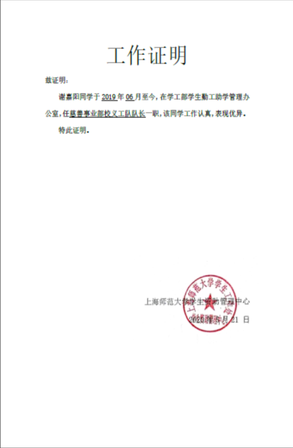 在学生工作上,谢嘉阳同学曾任校级义工队队长。谢嘉阳同学建章立制,制定了海角网 义工队长的管理办法等5部管理方法,有效地促进了义工队的日常工作和管理制度化、规范化。此外,在义工项目的管理和发展上,谢嘉阳同学提出了“保障基数、丰富内容”的原则和思路。“保障基数”,一是指贫困生的基数,义工活动中贫困生必须要充分地参与进来,二是除去贫困生的基数之后,能兼顾或者在一定程度上满足非贫困生的义工需求。“丰富内容”,开设更多的有助于大学生实现自我价值的活动。