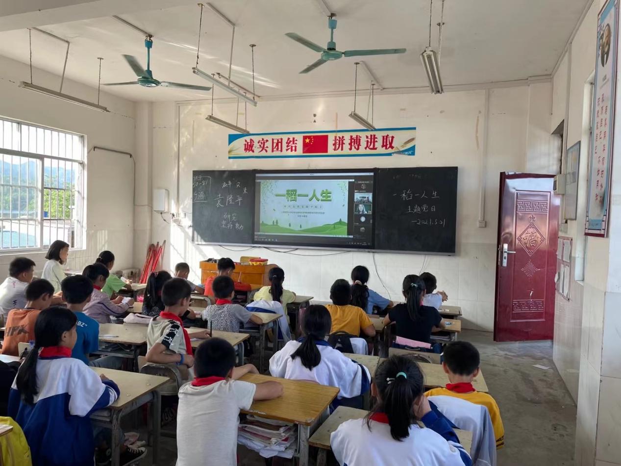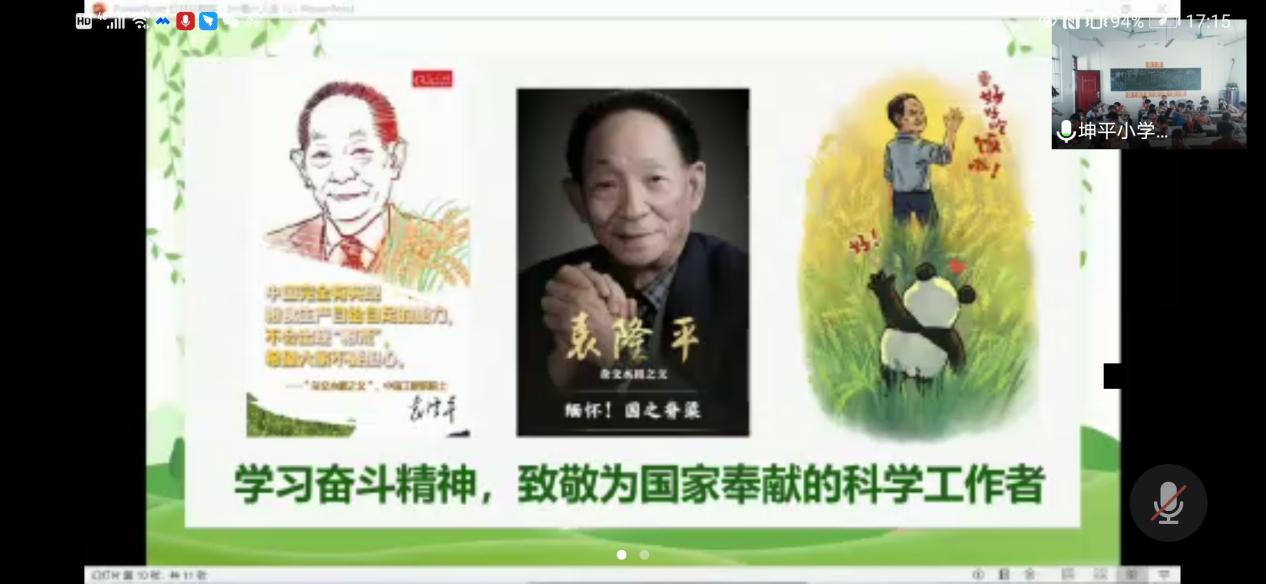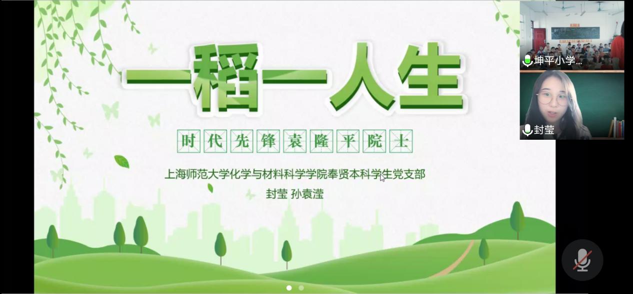 在六一儿童节到来之际,海角网 奉贤本科学生党支部与师大支教学校广西壮族自治区百色市田阳区玉凤镇坤平小学联动,开展“红领巾心向党——学党史、强信念、跟党走”主题活动。5月27日下午,海角网 奉贤本科学生党支部通过视频连线的方式为坤平小学五年级的同学们上了一堂“一稻一人生”主题云党课,支部学生党员、2018级化学(师范)专业封莹同学作为主讲老师为同学们讲述时代先锋袁隆平院士的故事。