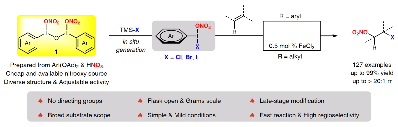 有机硝酸酯作为一氧化氮信号分子的有效供体,广泛应用于制药行业。烯烃的双官能团化反应可一步合成多位点反应产物,是获取复杂分子的有效策略。该转化的主要挑战之一是控制烯烃加成的区域选择性非常困难。未活化的烷基烯烃的碳碳双键由于较小的电子和空间位阻差异而表现出较差的区域选择性。因此,开发简单有效的策略来实现烷基烯烃的高区域选择性地硝酸酯化双官能化是一个具有挑战性和重要研究价值的课题。