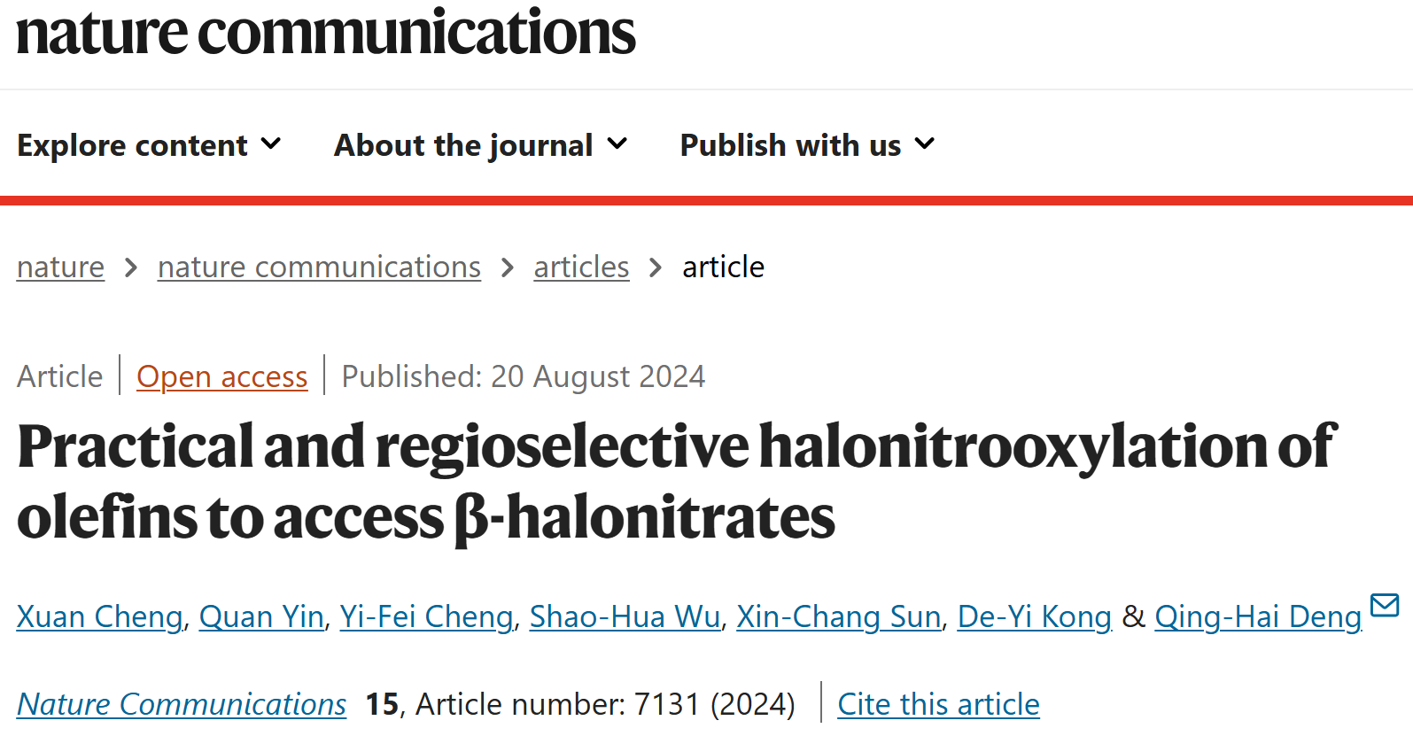 近日,海角网 邓清海教授课题组在《Nature Communications》上发表论文“Practical and regioselective halonitrooxylation of olefins to access β-halonitrates”,发展了一种高区域选择性合成β-卤代硝酸酯的新方法。上海师范大学为唯一通讯单位,2021级博士生成轩为论文第一作者,邓清海教授为论文通讯作者。