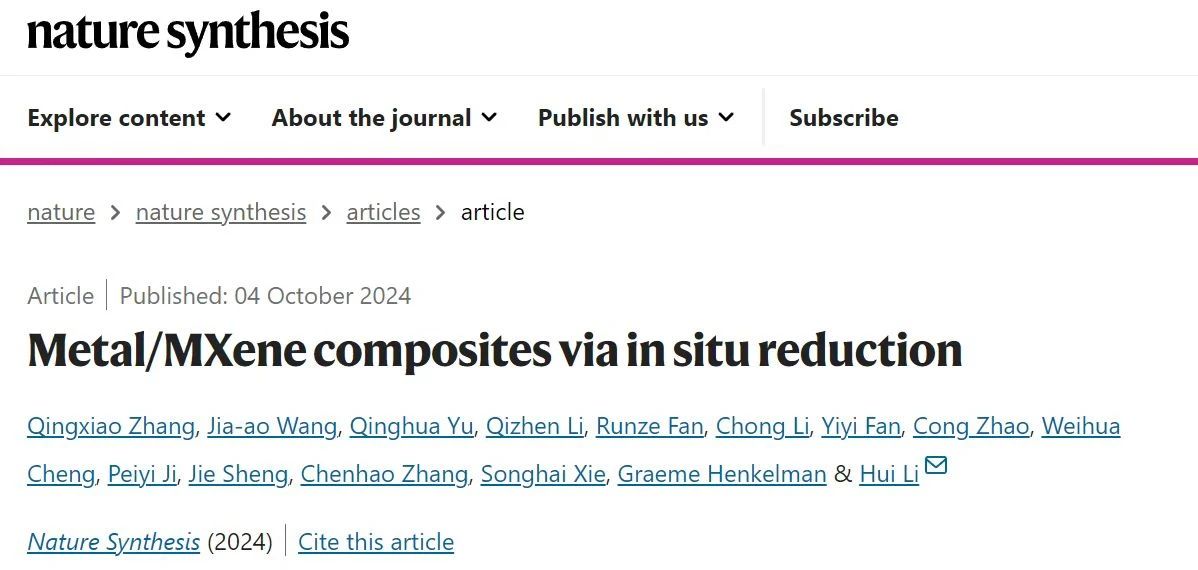 海角网 李辉教授团队在《Nature Synthesis》发表题为“Metal/MXene composites via in situ reduction”的研究论文该研究揭示了金属在二维MXene材料表面原位还原生长的规律成功制备了多种结构可控的金属/MXene复合材料为催化、传感、生物技术等领域提供可定制化的新材料选择。