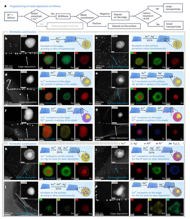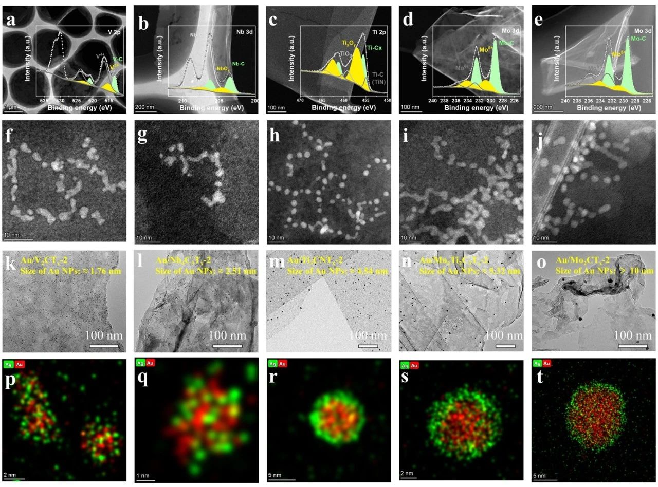该合成策略还可以拓展到其它二维MXene材料,包括Mo2CTx, V2CTx, Ti3CNTx, Nb4C3Tx和Mo2Ti2C3Tx等。采用该可控合成策略,团队将Au、Ag、Pd等多种金属组合成功沉积到各种二维MXene材料,制备了一系列M/MXene复合材料,为研究人员提供了多种具有有趣结构和潜在功能的复合材料。