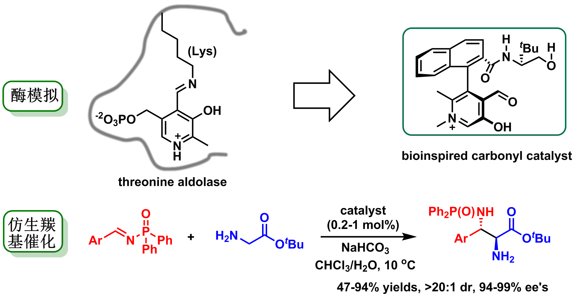 在本研究中,我们基于维生素 B6核心骨架发展了轴手性N-甲基吡哆醛催化剂,并用羰基催化的策略实现了仿生的不对称曼尼希反应。催化剂能像酶一样在含水体系中催化甘氨酸酯对亚胺的不对称加成,高活性、高选择avendomycin和血小板糖蛋白Ⅱb/Ⅲa受体拮抗剂Roxifiban中都含有手性a,b-二氨酸结构片断,该研究工作为此类化合物的制备提供了一种高效的、绿色的合成方法。反应如酶催化过程类似,催化剂对两个反应底物具有协同的双重活化作用,因此表现出非常优秀的催化效果。