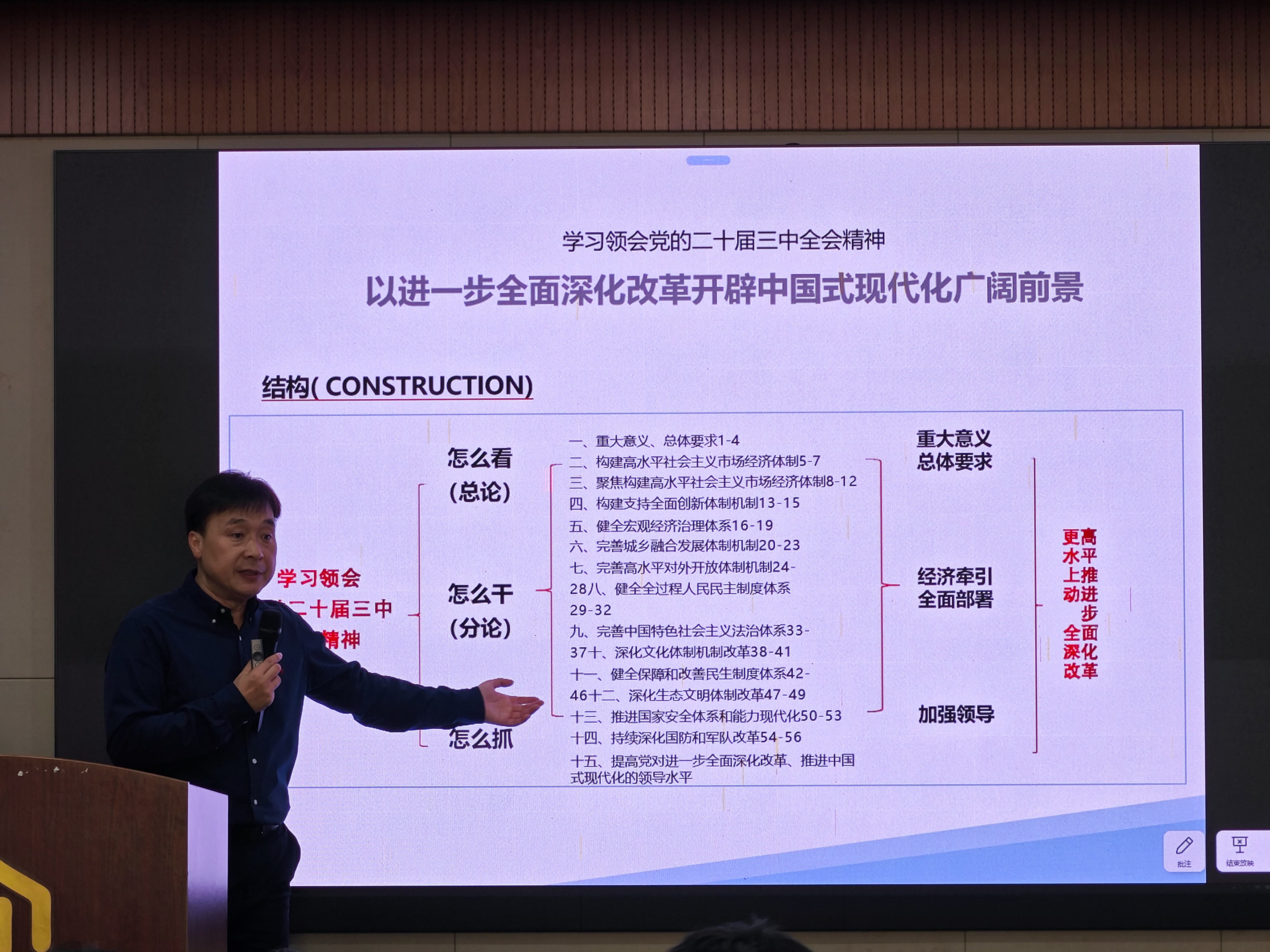 刘林教授从“怎么看”“怎么干”“怎么抓”三个方面带领海角网 教师一起学习领会党的二十届三中全会精神。他认为,要进一步明确党的二十届三中全会的重大意义和总体要求,提升改革意识,增强改革主动;要紧扣“中国式现代化”这个时代主题来聚焦改革重点;要提高党对进一步全面深化改革、推进中国式现代化的领导水平,确保各项改革任务落实落地。刘林教授的报告深入浅出,逻辑清晰,让海角网 的教师加深了对党的二十届三中全会精神的理解。