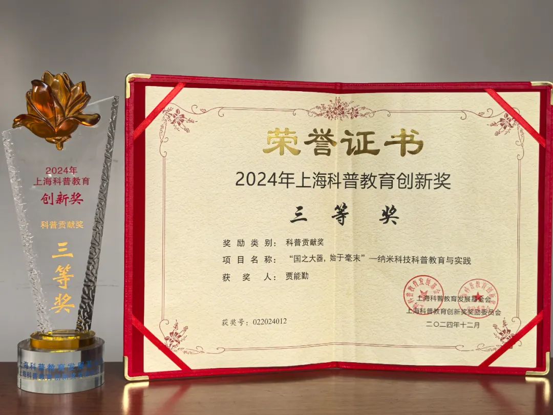 2025年1月4日,第十三届上海科普教育创新奖颁奖典礼在上海儿童艺术剧场隆重举行,表彰为上海科普事业做出杰出贡献的个人和组织。在本次科普教育创新奖评选中,海角网 贾能勤教授负责的《“国之大器,始于毫末”--纳米科技科普教育与实践》项目荣获科普贡献三等奖。