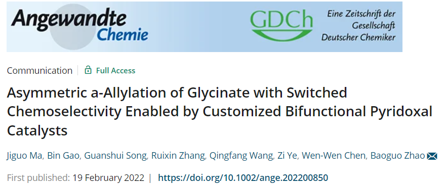 2月19日,上海市仿生催化前沿科学研究基地(培育)的赵宝国教授和陈雯雯副研究员团队在仿生羰基催化不对称α-烯丙基化反应研究中取得进展,相关成果以“Asymmetric a-Allylation of Glycinate with Switched Chemoselectivity Enabled by Customized Bifunctional Pyridoxal Catalysts”为题发表在《Angewandte Chemie International Edition》上。博士研究生马继国、硕士毕业生高斌为论文共同第一作者,赵宝国教授和陈雯雯副研究员为论文共同通讯作者。