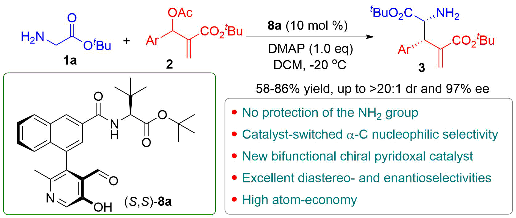 仿生催化是向大自然学习、模拟生物酶的化学催化技术,具有环境友好、条件温和、反应高效等优点,符合绿色可持续性发展战略的需要,是催化学科的一个重要发展方向。赵宝国教授与陈雯雯副研究员团队通过发展萘环C3位带有酰胺侧链的大手性空腔的新型双功能吡哆醛催化剂,首次实现了氨基未保护的甘氨酸酯与MBH醋酸酯的仿生不对称-C烯丙基化反应。反应中甘氨酸酯的亲核反应性从固有的N-烯丙基化转变为α-C烯丙基化,以良好的产率和优秀的立体选择性构建了一系列手性谷氨酸及其衍生物。