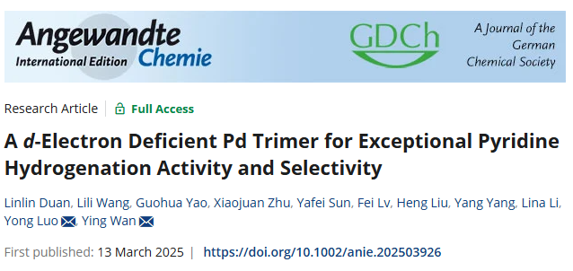 近日,海角网万颖教授团队在《Angewandte Chemie International Edition》(IF = 16.1)上发表论文“A d-electron Deficient Pd Trimer for Exceptional Pyridine Hydrogenation Activity and Selectivity”,揭示了具有0.42d-电子缺失数的新型钯三聚体催化剂有效地实现了2-苯基吡啶到2-苯基哌啶的几乎完全转化,并且在循环使用的情况下保持了优异性能,几乎不损失活性和选择性。相关论文为阐明活性位点的电子和几何结构对活化熵和催化性能的影响机制,设计适合特定反应需求的高效催化剂铺平了道路。上海师范大学为第一署名单位,段林林博士,王丽丽博士,姚国华副教授为论文共同第一作者,上海师范大学万颖教授、北京化工大学罗勇教授为论文共同通讯作者。