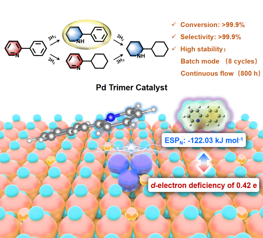 本文开发了一种以有序介孔氮掺杂二氧化钛-碳复合载体为基底负载钯的催化剂,并应用于2-苯基吡啶的氢化反应。基于活化熵关联分析、Hammett参数研究以及反应物吸附构型表征,分别探讨了活性位点(包括Pd的d电荷及其催化过程中形成的团簇结构)的影响机理。实验发现,具有0.42 d电子缺失数的Pd3三聚体催化剂在2-苯基吡啶和4-氰基吡啶氢化反应中展现出优异的转化率与选择性。该性能归功于其对吡啶环的吸附约束作用及对速率决定步骤中带负电荷过渡态的稳定化效应。该催化剂在8次间歇式反应循环和液相连续流动800小时的运行中,活性与选择性衰减极微,金属浸出量可忽略不计,表现出卓越的催化稳定性。