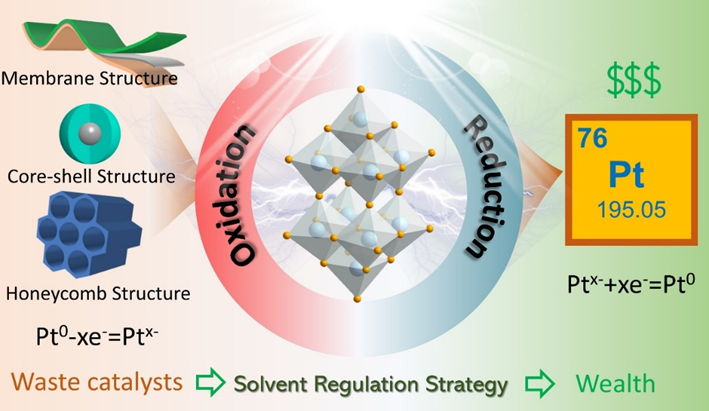 通过溶剂(乙腈/二氯甲烷混合体系)调控反应路径,揭示十钨酸盐的配体到金属电荷转移(LMCT)机制,驱动活性氧(O2⁻)、氰基自由基(CN)和氯自由基(Cl)生成,促进铂的氧化溶解(形成PtCl62−)和还原(Pt0,纯度>91%)。理论计算(TD-DFT/DFT)验证了反应热力学可行性(ΔG =−9.1至−32.2 kcal/mol),阐明电荷转移、自由基反应与催化循环的协同机制。同时,对工业级废料(如废Pt/Al2O3催化剂、燃料电池中膜电极)的高效处理,展现出规模化应用的可行性。