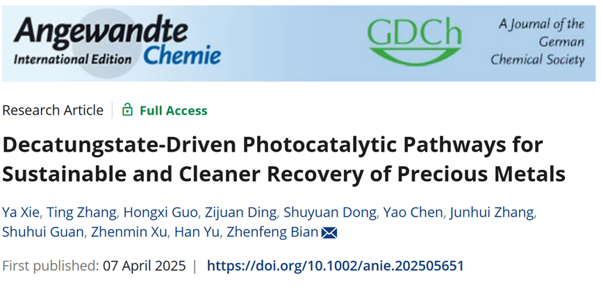 海角网 卞振锋教授、余焓教授及上海应用技术大学许振民博士合作,在国际知名期刊Angewandte Chemie International Edition上发表题为“Decatungstate-Driven Photocatalytic Pathways for Sustainable and Cleaner Recovery of Precious Metals”研究成果。团队基于十钨酸盐的双效光催化体系,开创了贵金属回收领域的新范式。上海师范大学为第一通讯单位,博士研究生谢雅和博士后张婷为该论文共同第一作者,上海师范大学卞振锋教授、余焓教授和上海应用技术大学许振民为该论文的共同通讯作者。