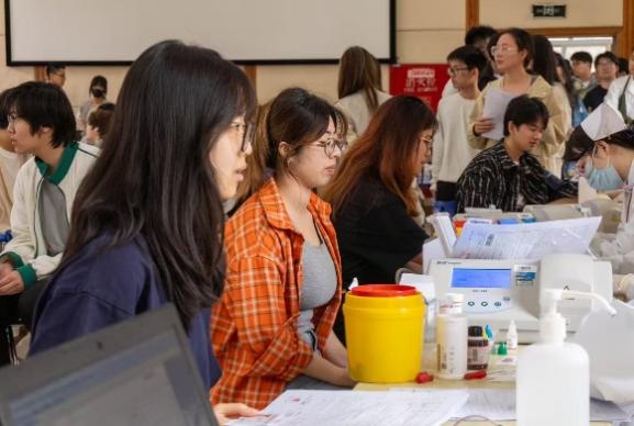 献血场氛围温暖而有序,同学们在志愿者的贴心引导下,依次完成登记表填写、血压测量、验血初筛等环节。符合条件的同学们安静地坐在等候区,等待着献出他们的热血。