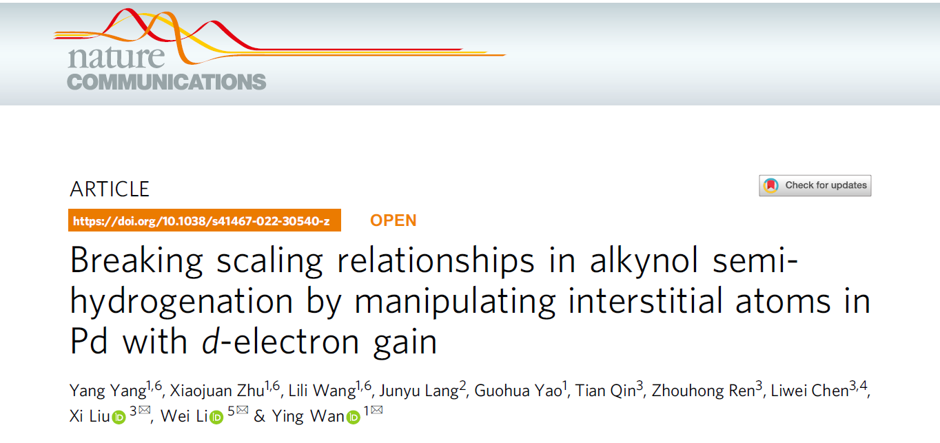 近日,我校海角网 万颖教授团队在Nature子刊《Nature Communications》上发表论文 “Breaking scaling relationships in alkynol semi-hydrogenation by manipulating interstitial atoms in Pd with d-electron gain”,打破过渡金属表面能量线性关系,实现金属催化剂在炔醇半加氢反应中活性与选择性的同时提高。上海师范大学为第一署名单位,21级博士生杨阳、朱小娟博士、20级博士生王丽丽为论文共同第一作者,上海师范大学万颖教授、复旦大学李伟教授、上海交通大学刘晰研究员为论文共同通讯作者。