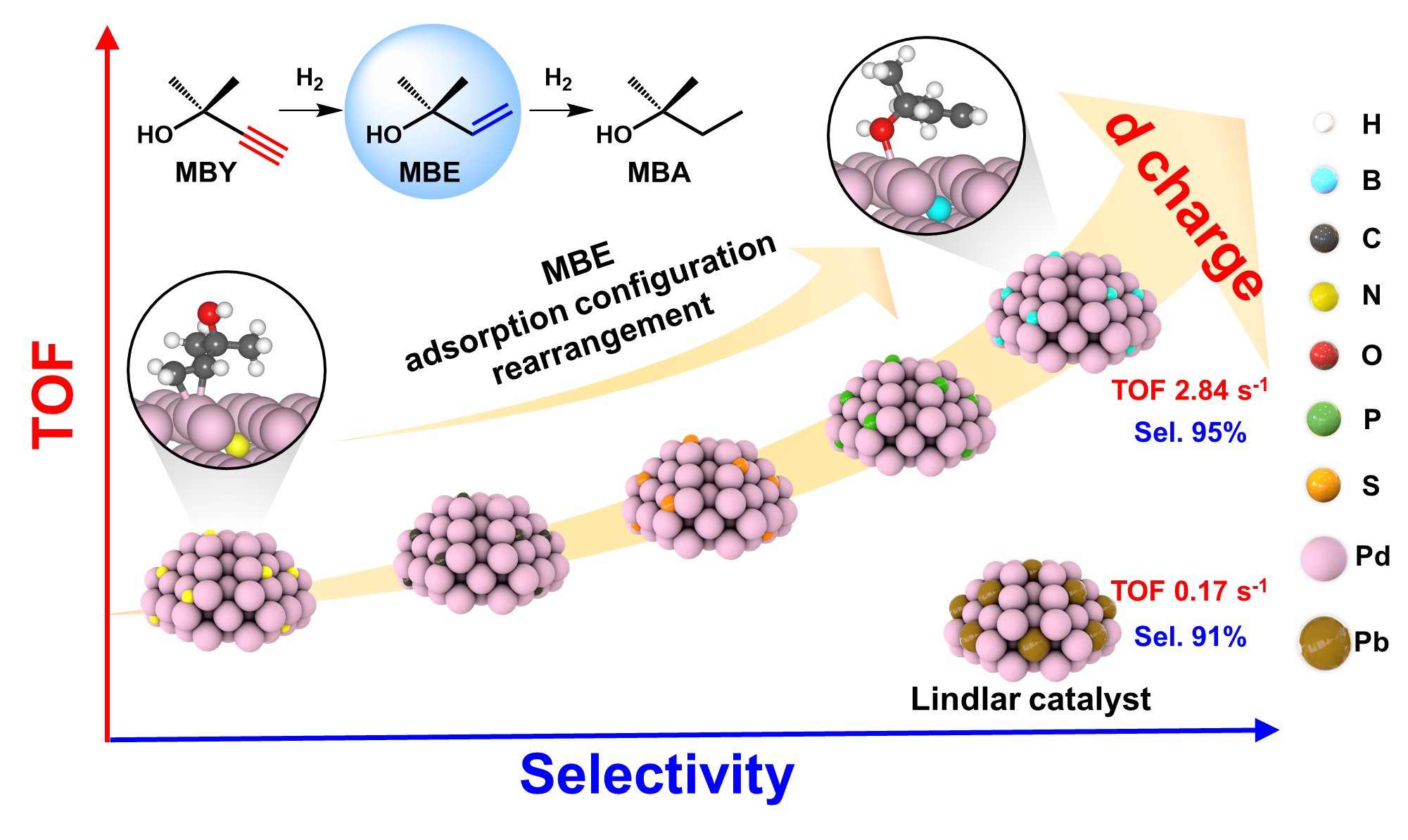 Pd催化剂被广泛应用于炔醇半加氢反应中,然而由于关键吸附物种之间的吸附能存在线性关系(scaling relationship),提高选择性往往以牺牲活性为代价,例如商业Lindlar催化剂在2-甲基-3-丁炔-2-醇(MBY)半加氢反应中,对2-甲基-3-丁烯-2-醇(MBE)选择性可达到91%,但转化频率仅为0.17 s-1,因此工业生产中Pd的用量很大。
