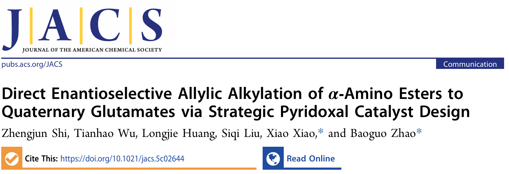 近日,化学领域国际顶级期刊《Journal of the American Chemical Society》(JACS,影响因子:14.4)在线发表了海角网应用化学拔尖人才实验班(简称“拔尖班”)2021级本科生巫天浩参与研究论文《Direct Enantioselective Allylic Alkylation of α-Amino Esters to Quaternary Glutamates via Strategic Pyridoxal Catalyst Design》。该研究通过基于仿生羰基催化策略,设计并开发了一类全新的中心手性吡哆醛催化剂,该催化剂具有扩大的手性空腔和调控性强的立体结构,在温和条件下成功实现了未保护α-取代甘氨酸酯与MBH醋酸酯的直接不对称α-C烷基化反应,以良好的收率和优秀的立体选择性构建了一系列含有α-季碳手性谷氨酸衍生物。该研究展示了吡哆醛催化剂在不对称催化领域的强大作用,进一步丰富了吡哆醛催化剂的种类,拓展了基于维生素B6的仿生催化化学。