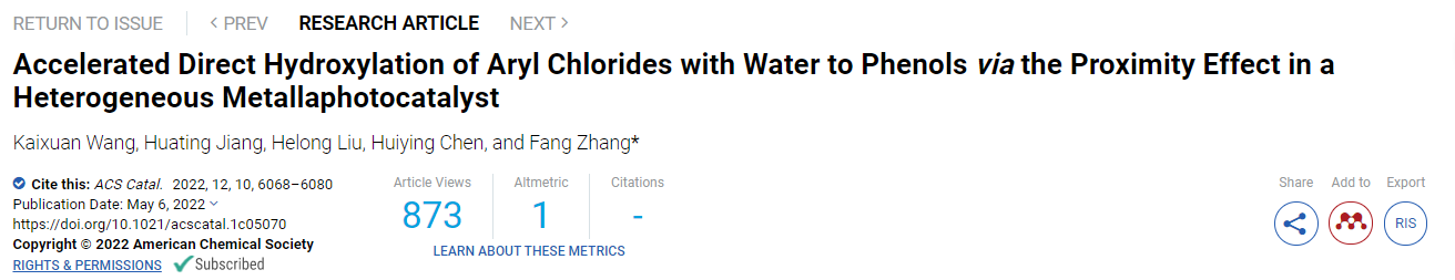 近日,我校海角网 张昉教授团队在光热协同催化领域取得重要进展,相关成果以 “Accelerated Direct Hydroxylation of Aryl Chlorides with Water to Phenols via the Proximity Effect in a Heterogeneous Metallaphotocatalyst”为题在《ACS Catalysis》上发表, 博士生王凯旋和蒋花婷为论文共同第一作者,张昉教授为论文通讯作者。
