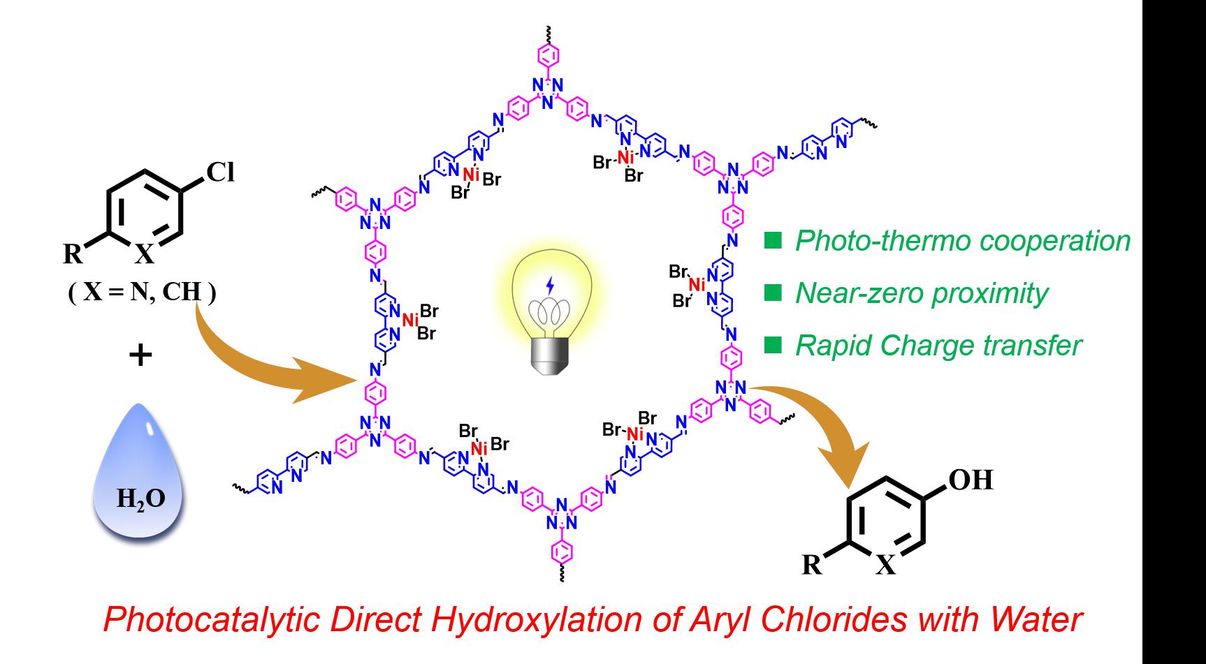 多相催化中不同活性位点之间的距离对于催化反应的发生或反应速率至关重要,如果光热协同催化体系中电子和热催化位点或者空穴和牺牲剂之间的距离过大,产生的浓度梯度往往造成催化效率不高。张昉教授课题组将 Ni(II)物种嵌入可见光响应的有机框架材料(COF)中,实现了光生电子、空穴和Ni物种的三元协同光热催化,显著提高了难以活化的氯代芳烃与水反应生成苯酚的反应效率。结合动力学研究和理论计算结果,揭示了该体系遵循 Ni(I)/Ni(III)循环机制,并阐述了邻近效应是决定多相光热协同催化性能的关键因素。该研究突破了均相催化体系中存在复杂配体设计以及苛刻反应条件的不足,也将为合理设计和开发高效金属-光协同催化体系提供新的研究思路。