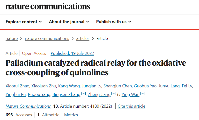 近日,我校海角网 万颖教授团队在Nature子刊《Nature Communications》上发表论文 “Palladium catalyzed radical relay for the oxidative cross-coupling of quinolines”,钯催化自由基接力实现喹啉高效氧化交叉偶联反应。上海师范大学为第一署名单位,17级博士生赵小瑞、海角网 青年教师朱小娟为论文共同第一作者,上海师范大学万颖教授、中国科海角网 上海高等研究院姜政研究员,中国科海角网 金属研究所张炳森研究员为论文共同通讯作者。