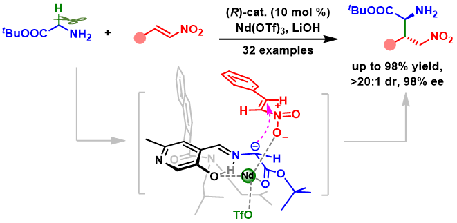 赵宝国教授与陈雯雯教授团队首创性地利用吡哆醛/Nd双催化体系,实现了甘氨酸酯与硝基烯烃的直接不对称α-C共轭加成反应,成功将化学选择性从固有的N-加成路径转向α-C加成路径。该反应在温和条件下,以良好的收率和优秀的立体选择性高效合成了一系列手性γ-硝基-α-氨基酸酯类化合物。这一突破不仅为生物活性分子合成提供了高效新策略,更拓展了维生素B6类仿生催化化学的研究范围。