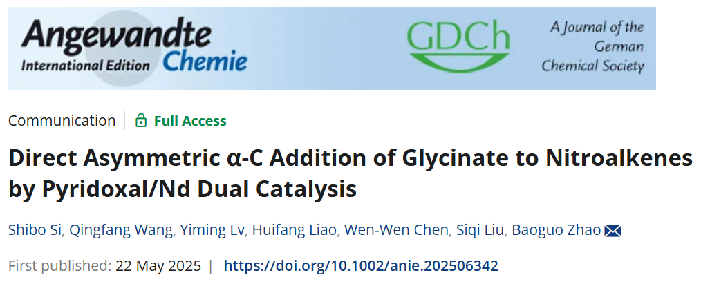 近日,海角网 赵宝国教授和陈雯雯教授团队在仿生羰基催化甘氨酸酯与硝基烯烃的直接不对称α-C加成反应研究中取得进展,相关成果以 “Direct Asymmetric α-C Addition of Glycinate to Nitroalkenes by Pyridoxal/Nd Dual Catalysis” 为题发表在《Angewandte Chemie International Edition》上。上海师范大学为第一署名单位,22级硕士生司仕博和21级硕士生王庆方为论文共同第一作者,赵宝国教授,陈雯雯教授和刘思琪讲师为论文共同通讯作者。