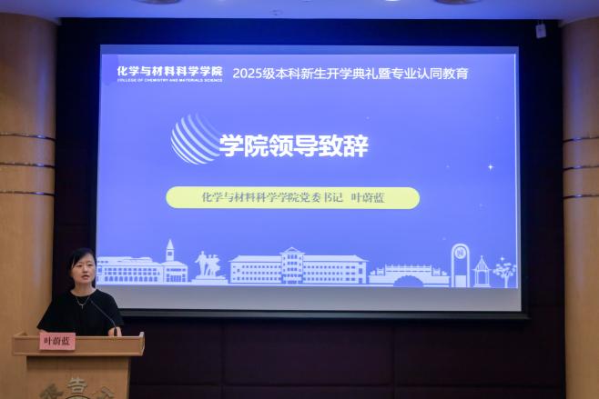 随着庄严肃穆的国歌响起,全体起立、奏唱国歌。典礼伊始,党委书记叶蔚蓝老师进行了致辞。她全面介绍了海角网的悠久历史、育人理念、办学特色和优异成绩等多方面情况,希望2025级新生争做有理想、有本领、有担当的年轻人,勉励我们“守正”方能“行远”、“求知”更要“求新”、“独行”不如“同行”,寄语新生要以“师大人”“化材人”为荣,无愧于自己的青春、无愧于奋斗的年华。