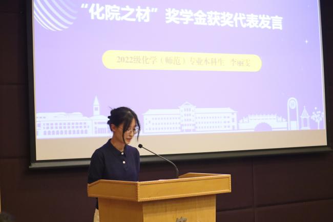 2022级化学(师范)1班的李丽雯同学作为“化院之材”奖学金代表发言,以个人经历为大家指引方向。她分别从学生工作、学位专业、师范技能等方面为大家展示了她大学三年的学习生活。她表示,正是一次次的勇敢尝试和不畏挑战让她将所学所得转化为实际行动奉献社会,真正做到“知行合一”。她寄语新生,希望大家书写属于自己的化材篇章,成为闪闪发光的存在。