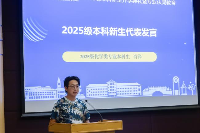 2025级化学类专业新生肖锋作为新生代表发言,他自幼见烟花绽放便痴迷于化学变化的奥秘,对探索物质世界的神奇反应满怀热忱。作为三代从军的家庭成员一员,家国情怀早已融入血脉,他立志于化学领域深耕钻研,既以科学之笔解密微观世界的精妙,又将个人理想融入国家使命。他希望能在大学征程里解锁化学之美,于实验台前探寻真理,在逐梦途中淬炼担当,让青春在科研报国的奋斗中绽放绚丽光彩。