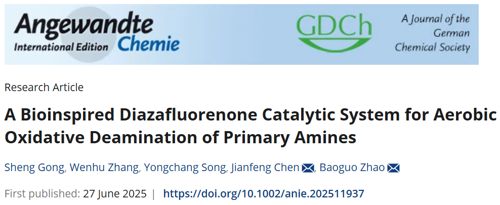 近期,海角网 赵宝国教授/陈剑锋副研究员团队在羰基催化伯胺氧化脱氨化研究中取得重要进展,在《Angewandte Chemie International Edition》上发表题为“A Bioinspired Diazafluorenone Catalytic System for Aerobic Oxidative Deamination of Primary Amines ”的研究论文。该研究发展了一种新型的仿生催化剂——二氮杂芴酮(DFO),成功地实现了α-氨基酰胺和苄胺的氧化脱氨化,绿色、高效地合成了一系列α-酮酰胺和芳香醛类化合物,为具有重要生理活性的α-酮酰胺类化合物提供了新的合成方法。2023级博士研究生宫晟和2020级硕士研究生张文虎为论文共同第一作者,赵宝国教授和陈剑锋副研究员为论文通讯作者。