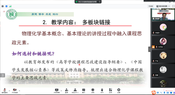 韩愈说过,“师者,所以传道受业解惑也”。贾老师分享的“课程思政”的概念,承载着培养大学生世界观、人生观和价值观的重要作用。我们唯有立足化学专业特点,全面推进化学学科的课程思政建设,才能真正构建起全员全过程全方位育人的大格局。