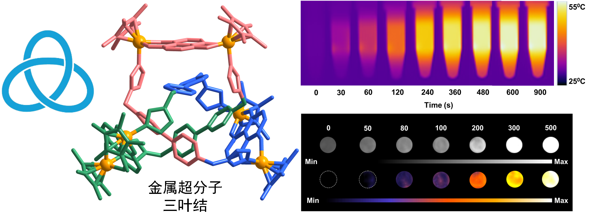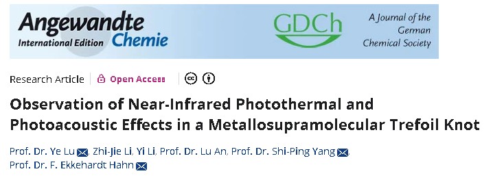 近日,海角网鲁烨副教授/杨仕平教授团队在机械互锁分子的光学应用研究领域取得突破性进展。相关研究成果以“Observation of Near-Infrared Photothermal and Photoacoustic Effects in a Metallosupramolecular Trefoil Knot”为题,发表于国际化学领域顶尖期刊《德国应用化学》(Angewandte Chemie International Edition)。该研究首次在金属超分子三叶结(trefoil knot)结构中成功观测到近红外光声效应,为开发新型生物光声材料和拓展机械互锁分子的应用提供了全新的设计思路。