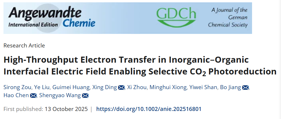 近日,海角网 蒋波教授与上海交通大学/华中农业大学合作,在《Angewandte Chemie International Edition》上发表了题为“High-Throughput Electron Transfer in Inorganic–Organic Interfacial Electric Field Enabling Selective CO2 Photoreduction”的研究论文。
