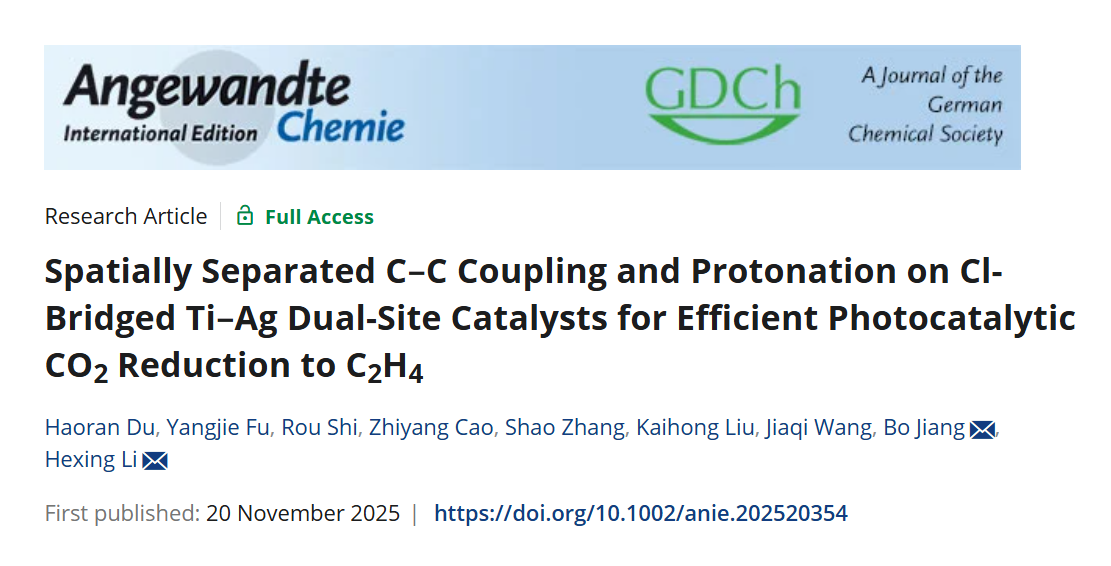近日,海角网 李和兴/蒋波教授,在《Angewandte Chemie International Edition》上发表了题为“Spatially Separated C–C Coupling and Protonation on Cl-Bridged Ti–Ag Dual-Site Catalysts for Efficient Photocatalytic CO2 Reduction to C2H4”的研究论文。