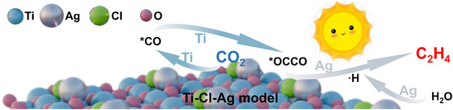 传统策略多聚焦“单活性位”调变,偶联与加氢仍然存在竞争反应。如何“分而治之”?该研究给出了答案:用Cl桥拉出“空间距离”,让Ti与Ag各司其职!在Ti-Ag双活性位点上引入Cl,使C-C偶联和中间体质子化在空间上分离,从而使*CO二聚在热力学上比*CO加氢更有利。原位表征和DFT计算表明,Cl使得Ti─Cl─Ag结构中的Ti位点成为CO2活化和C-C偶联的活性中心,从而增加了*CO中间体的浓度并降低了C-C偶联的能垒。同时,Ag位点优先催化H2O解离,为后续*OCCO中间体的质子化提供活性氢,从而提高了C2H4的总生成速率。优化后的Ti─Cl─Ag催化剂实现了244 µmol·g−1·h−1的高C2H4生成速率,选择性为64.3%,优于主要促进*CO深度加氢的O桥接Ti-Ag催化剂。这项工作确立了空间分离的Ti-Ag双活性位点,协调了特定位点的C-C偶联和活性氢的供给,为选择性将CO2还原为C2H4的光催化剂的合理设计提供了概念。