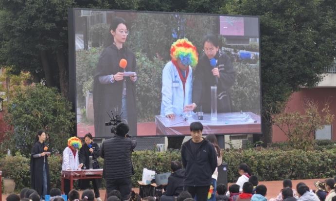 为实现优质科教资源共享最大化,本次展演以“线下专场+线上直播”形式,覆盖该校六至九年级及小学部,打破了学段与空间的限制。团队精心筛选八大探究性实验,既保证科学原理的严谨性,又兼顾展示过程的趣味性,以直观实验现象引导学生探寻科学本质。展演活动涵盖大象牙膏、氢氧爆鸣、可乐火山、空气炮、法老之蛇、元素的彩虹、化学钟摆及冰封时刻等经典趣味化学项目。