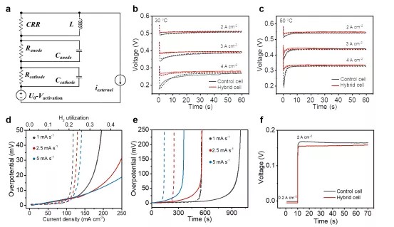 ▲图4:由WO3层赋予的增强瞬态性能的根源。(a)复合电池和对照电池的等效电路模型。 (b, c)分别在30°C (b)和50°C (c)条件下,将电流密度从0.2 A cm-2切换到2 A cm-2、3 A cm-2和4 A cm-2时,复合电池和对照电池的电压-时间测量及拟合曲线。(d, e)不同扫描速率下,复合电池(实线)和对照电池(虚线)的阳极过电位、电流密度和H2利用率(d)及时间(e)的关系。10 mL min-1 H2(100%湿度)分别通入阳极和阴极。(f)混合电池和对照电池在30°C下从0.2 A cm-2切换到2 A cm-2时的电压分布图。将50 mL min-1H2(100%湿度)分别通入阳极和阴极。