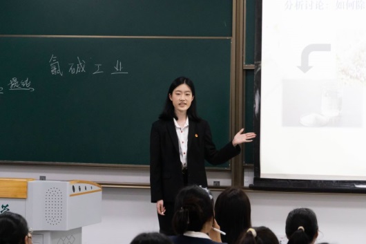 张文艳以“打开我国氯碱工业大门的吴蕴初先生”的介绍入手,结合涉及生活方方面面的氯碱工业产品,引出了课程。她结合以氯碱工业为基础的化工生产图与实验视频,细致深入地讲解了氯碱工业的重要环节——粗盐提纯、电解饱和食盐水,并介绍了离子交换膜。如今工业上广泛使用的离子膜交换法首先在1975年的日本、美国实现工业化,我国虽然氯碱产量高,但几十年来一直需要进口这有着高技术含量的薄薄的离子交换膜。直到2010年,我国在离子交换膜技术上取得了重大突破,成为了全球第3个拥有氯碱离子膜核心技术和生产能力的国家,标志着我们国家从氯碱大国向氯碱强国的迈进。张文艳带领同学们深刻感受到了科技进步对国家发展的重要推动作用,实业家吴蕴初先生发展民族工业的爱国主义精神和刻苦钻研、不断进取的优秀品质值得我们学习。